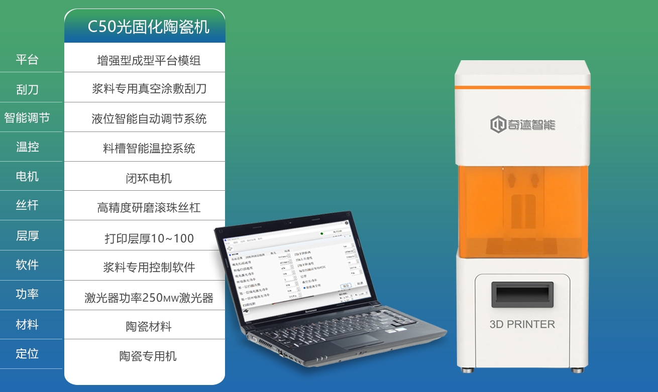 成型结构更稳:采用“平台下沉—激光固化—真空刮料”闭环流程,成型面始终浸在陶瓷浆料中,彻底规避高粘度浆料铺展难题,单层厚度精准控制在0.03~0.15mm,定位精度达±5μm,发丝级细节也能完美还原。